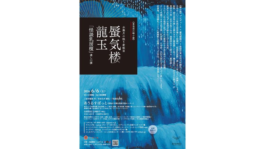《噺小屋》プロデュース×蜃気楼龍玉×落語作家 本田久作タッグで2016年から独自の公演を製作、三遊亭圓朝作品「緑林門松竹」「怪談牡丹燈籠」「怪談乳房榎」「真景累ヶ淵」、近松門左衛門「女殺油地獄」をお届けしてきました。今年は2023年国立演芸場にて初演の「怪談乳房榎」通しを3年ぶりに再演いたします。